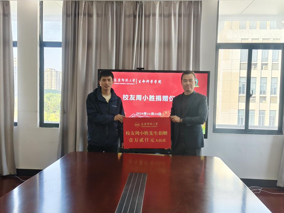 近日,生命科学学院在G402隆重举行校友捐赠仪式。生物科学专业2011级校友周小胜、学院院长吴彦、学院党委副书记兼纪委书记张辉和师生代表参加活动。捐赠仪式由副院长李从虎主持。
