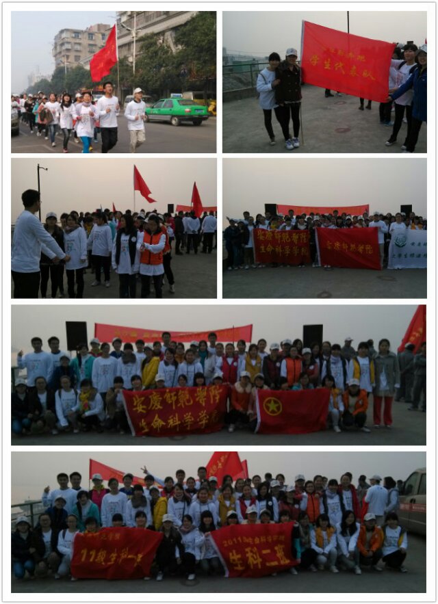 12月4日上午,由世界自然基金会(WWF)、武汉白鱀豚保护基金会(WBCF)主办,安庆市农委,安庆师范学院团委承办的在长江中下游开展“为江豚来奔跑—2013长跑接力”安庆段接力活动,在安庆市长江江豚保护区长江干堤正式举办。黄石长跑队,安庆渔政长跑队,安庆师范学院长跑队,安庆渔民长跑队,省市有关新闻媒体记者等共计200余人到场,生命科学学院团员志愿者50余人作为学校代表队参加了本次长跑宣传活动。