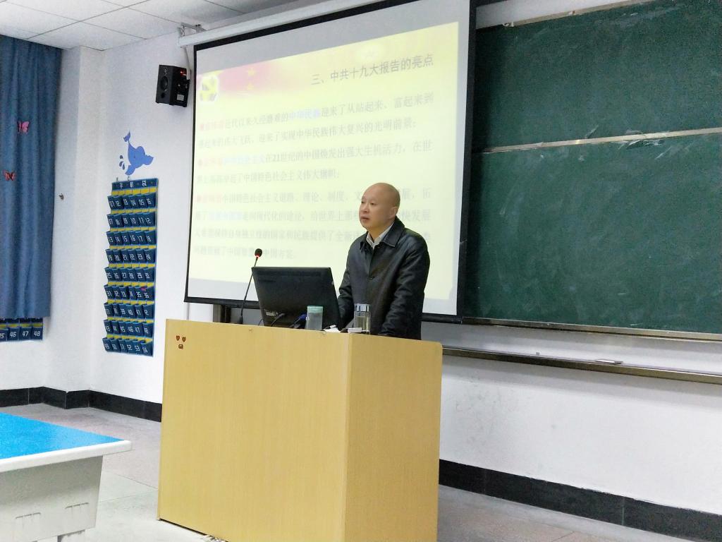 我院党总支书记吴甘霖以“中国特色社会主义进入新时代”为题概括了十九大召开的主要过程,以十九大的背景、框架、亮点、主要成果四大方面,多方位、深层次的向我们解读十九大精神。结合十九大主题“不忘初心,牢记使命”向我们反复强调了初心和使命的意义;“初心”既是为中国人民谋幸福,“使命”既是为中华民族谋复兴。随后,吴甘霖从七个方面介绍了十九大“亮点”,特别强调党建的总要求,坚持和加强党的全面要求、以党的政治建设为统领、以坚定理想信念宗旨为根基、调动全党积极性、主动性、创造性为着力点,全面推进党的政治建设、思想建设、组织建设、作风建设、纪律建设,把制度建设贯穿其中。