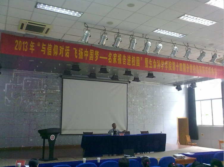 5月8日下午,生命科学学院团总支在菱湖校区图书馆学术报告厅举办了“与信仰对话,飞扬中国梦—名家报告进校园”专家报告会。本场报告会有幸邀请到我校原党委书记,现任校关工委主任朱建华同志担任主讲。学院党总支副书记朱庆丰同志,党政办公室主任吴娟同志,专兼职辅导员,全体学生党员、预备党员,第十四期分党校全体学员参会,报告会由团总支副书记曹勇主持。