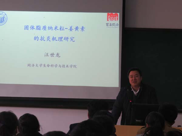 12月25日下午,同济大学生命科学与技术学院副院长汪世龙教授在G106教室作了题为"固体脂质纳米粒姜黄素的抗炎机理研究"学术报告。学术报告由生命科学学院吴甘霖院长主持,生命科学学院部分老师和学生听取了报告。