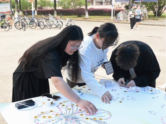 “我们用一朵朵小花拼成了一束大花,感觉十分有趣。”数学与应用数学专业2020(5)班的芮瑞感叹。平时就擅长手工的她,和好友在“百花齐放”展板前精心挑选贴纸,合作拼贴出一朵花的图案,“以花绘花”的创作吸引了许多学生驻足观看。临走前,芮瑞用手机记录下了这一色彩纷繁的“花朵”。