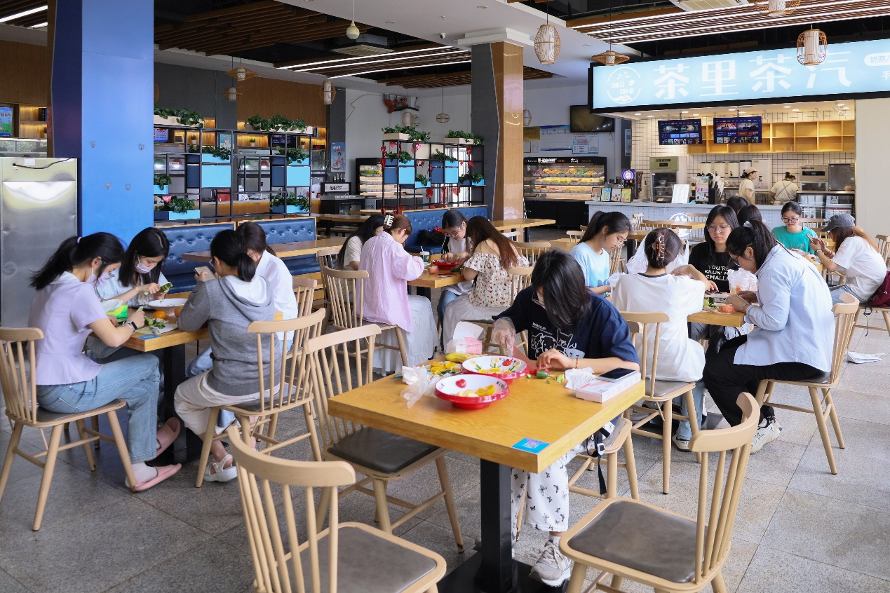在水果拼盘设计环节中,15组参赛选手各显神通。比赛现场,有的团队以“游龙舟”为主题,将黄瓜切成小片作鳞片,拼接成龙身,黄瓜雕出龙头,苹果切成小船;有的团队打造出“熊猫攀竹”,用黄瓜巧妙雕出竹竿,苹果片和黄瓜皮垒出小熊猫……不同的水果拼盘作品在学生们手中诞生。