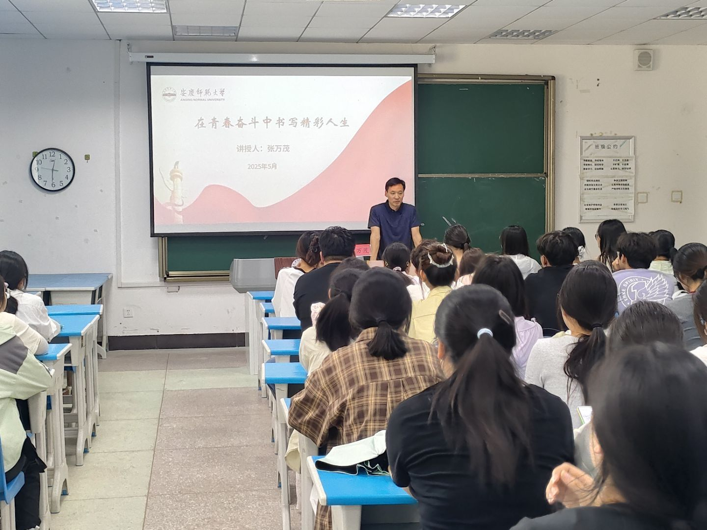 张万茂围绕“精”“静”“进”“劲”“净”五字展开,涵盖学习、生活、工作及情感等多个方面。报告中,张万茂以个人经历、学生的真实情况,以及名人事迹为例,引用大量名言警句,勉励学生在人生道路上要坚定信念、精益求精,静心修身、沉淀自我,锐意进取、不断创新,锲而不舍、勇攀高峰,净化心灵、自律自警,努力实现自己的目标和理想,在青春奋斗中书写精彩人生。