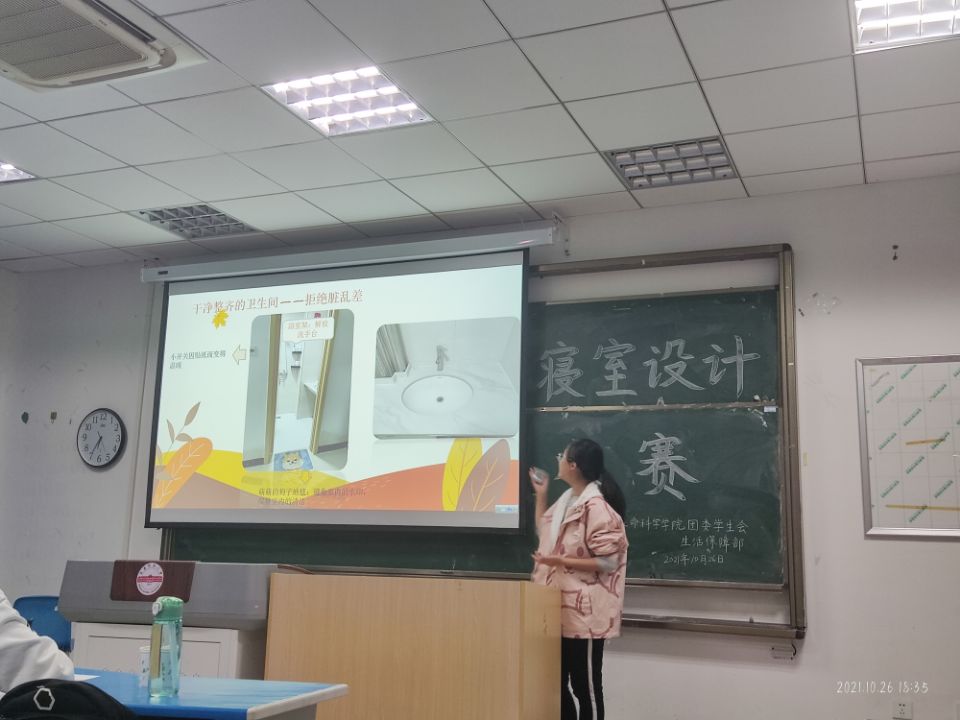 为了促进良好室风建设,强化良好卫生习惯养成,提高寝室生活质量,培养同学间团结合作精神,生命科学学院于10月26日下午在G103教室举办了“我居我饰”寝室设计大赛总决赛。