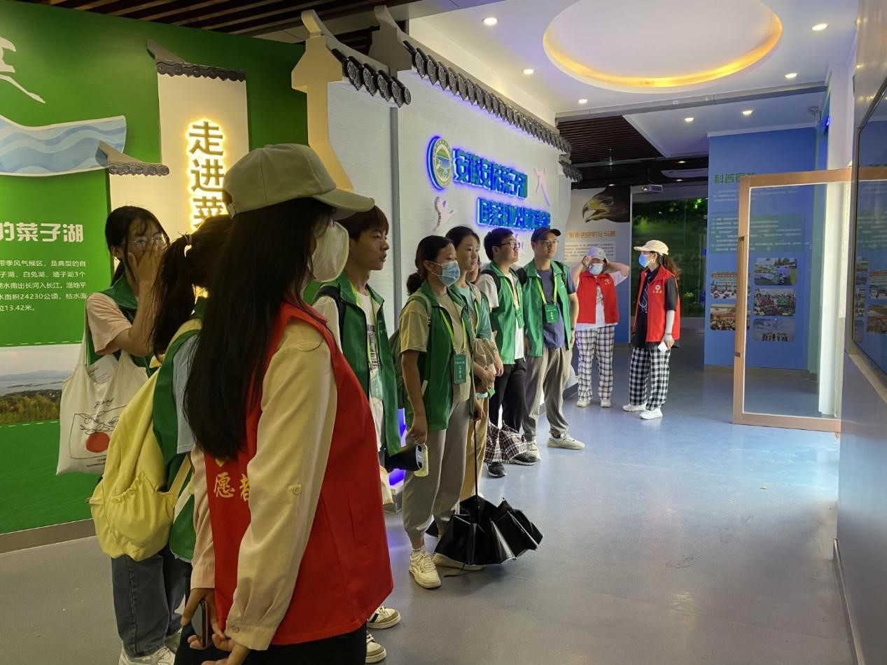 6月29日,实践团一行十余人奔赴安庆菜子湖国家湿地公园,开展实践调研活动。“走进菜子湖”、“湿地野趣”、“鸟的天堂”、“文化溯源”、“保护菜子湖”,团队依次参观科普宣教馆的5个展厅,聆听志愿者的科普讲解;睡莲、荷花、水蕨、槐叶萍,在绿色水生植物科普园的生态游道上,团队成员对照植物解说牌,深入了解了坑塘里多种多样的水生植物。