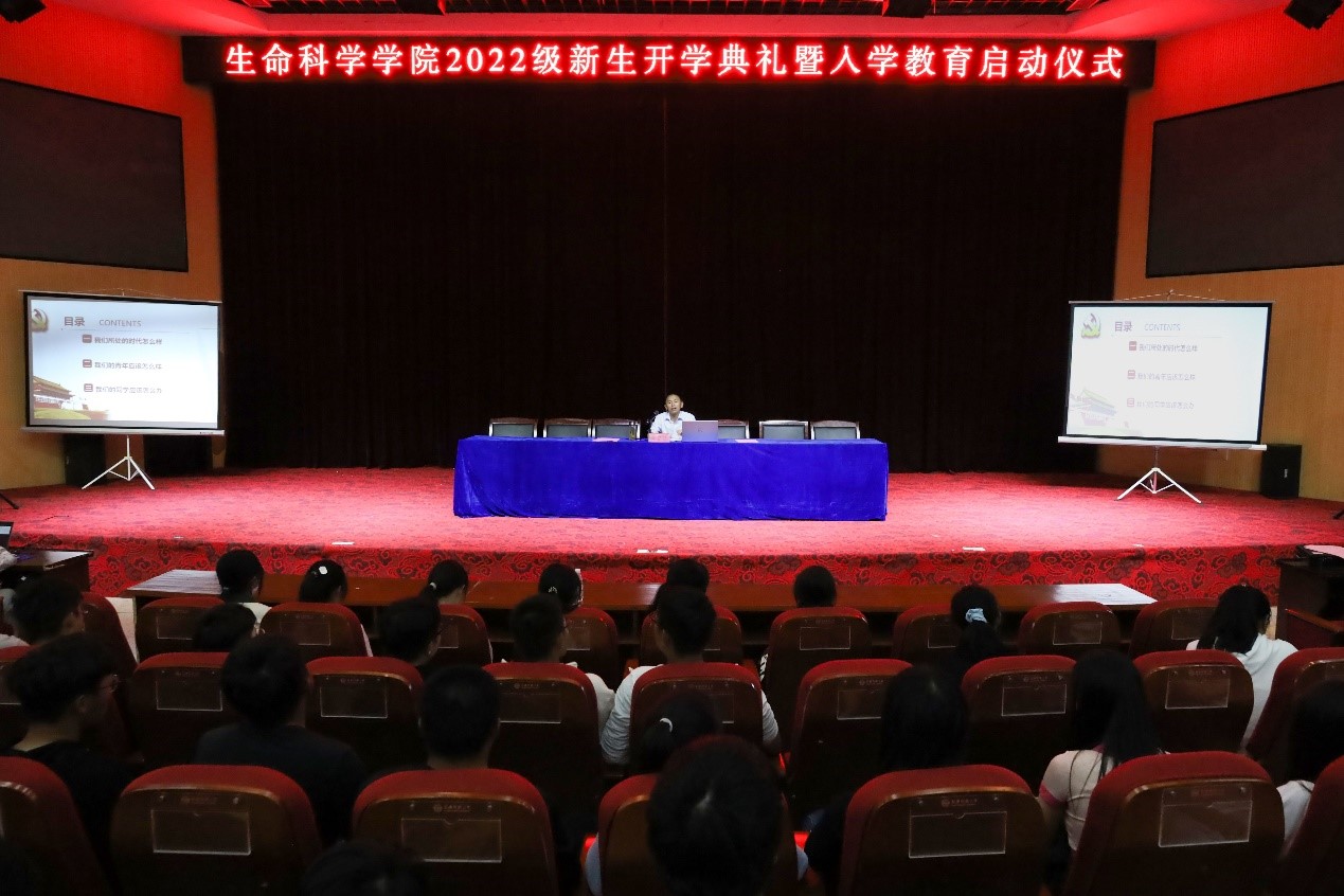 9月24日,生命科学学院党委书记朱昌流在图书馆东报告厅为2022级全体本科、研究生新生做了主题为《青春有幸逢盛世 奋斗无悔展宏图》的专题报告,进一步落实《生命科学学院2022级新生“1+3+N”模式入学教育实施方案》,提高大学生政治素养,培养大学生社会责任感和使命感。
