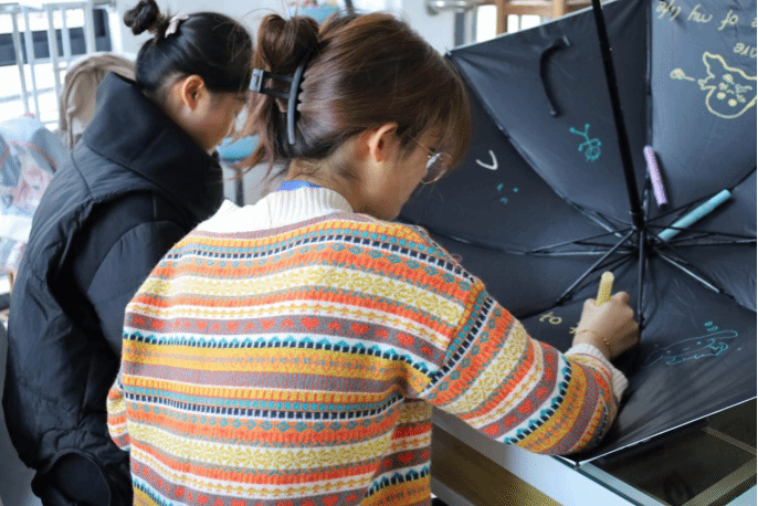 现场气氛活跃,参与学生纷纷发挥自己的创意,在伞上留下“温暖的印记”。选取样式、勾勒线条、填充颜色,生物科学类专业2023(2)班的王叶梅手边摆放着五颜六色的画笔,她正在专注地画着一个彩虹,“人生处处是彩虹,雨季过去便是万里晴空,愿大家的世界永远阳光明媚,色彩斑斓。”