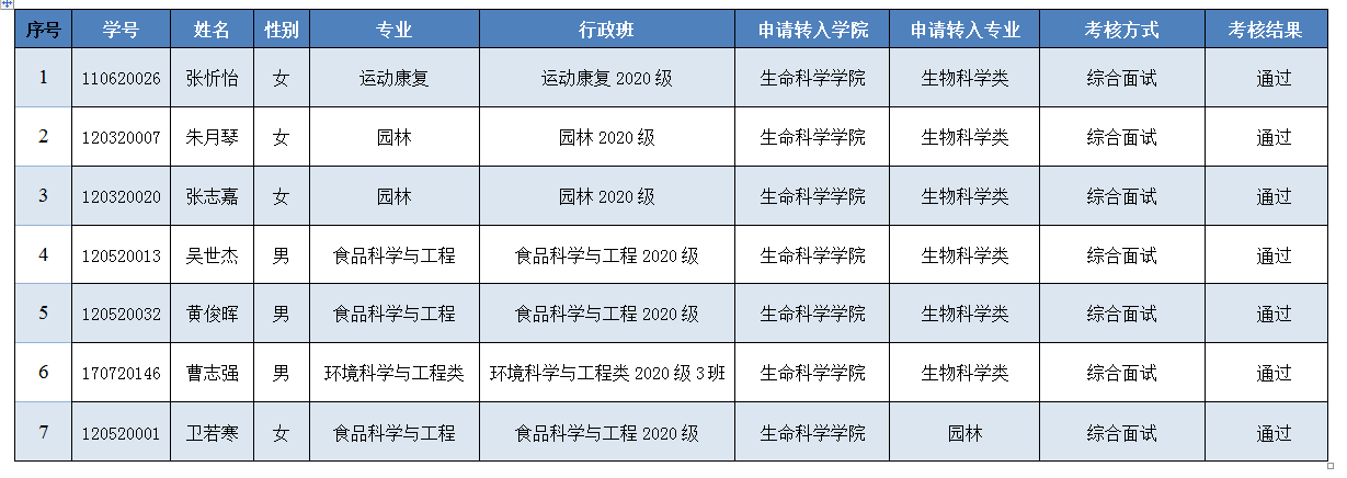 现将生命科学学院2020-2021学年转专业学生考核结果公示如下: