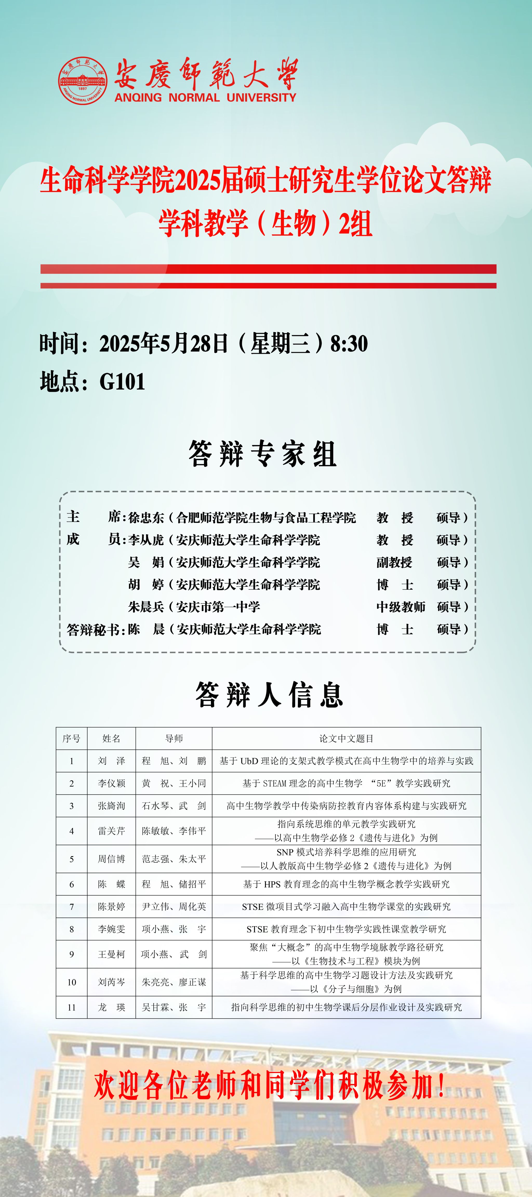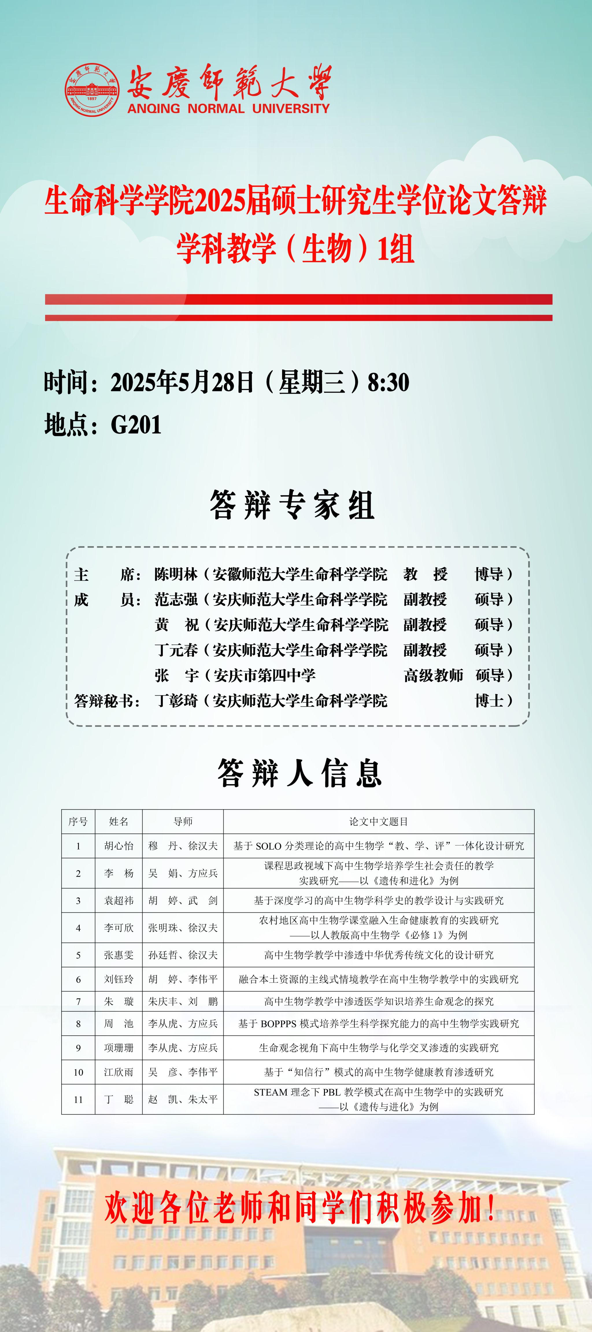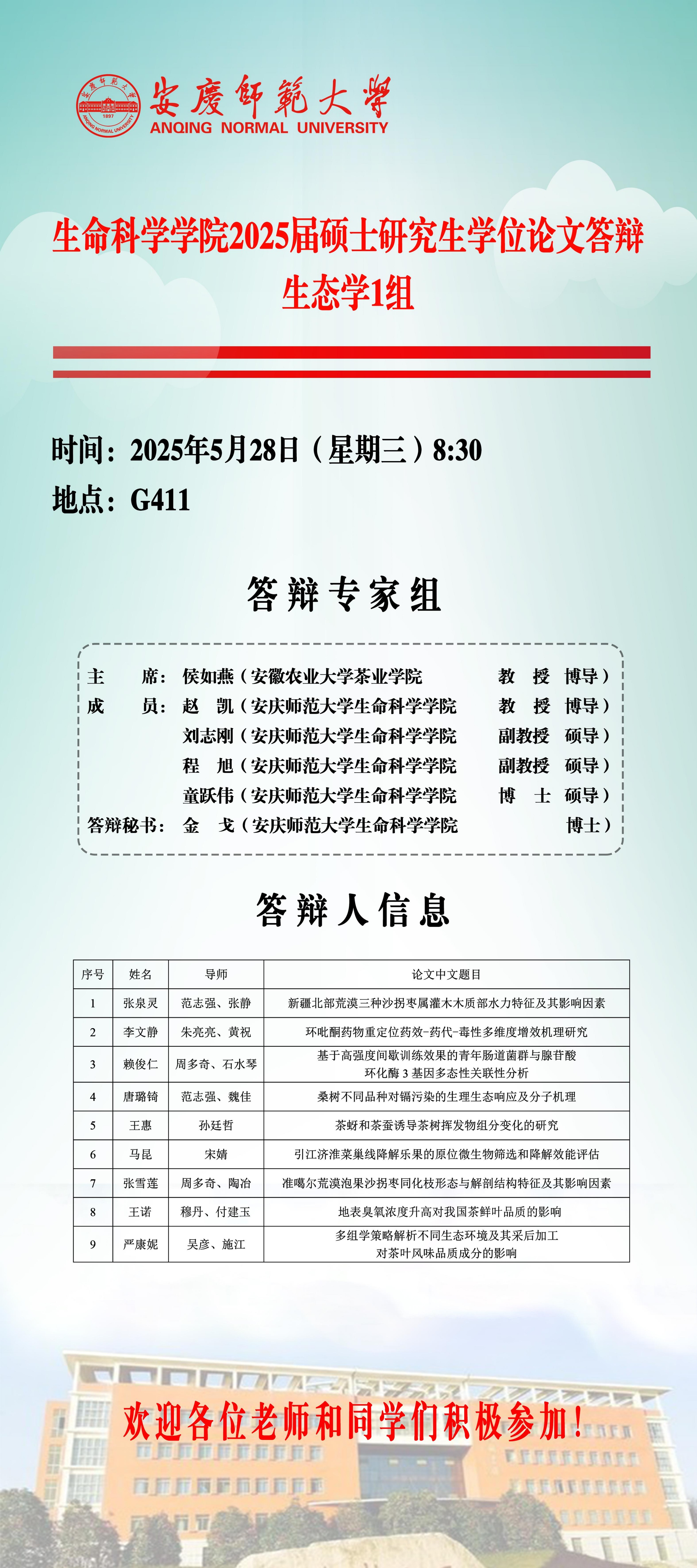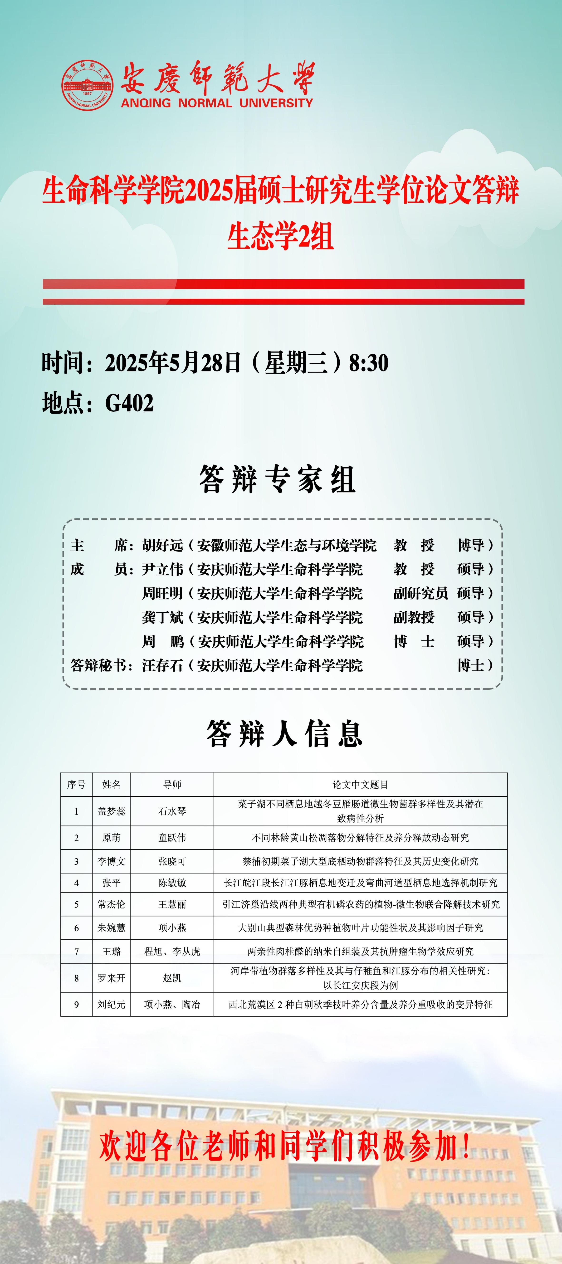 生命科学学院2025届硕士研究生学位论文毕业答辩安排