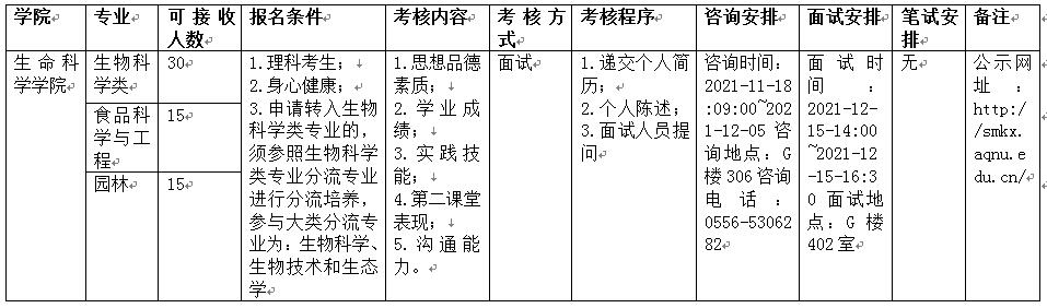 一、生命科学学院各专业转入和转出,生物科学大类8个班级可接收30人,食品科学与工程和园林专业各接收15人。