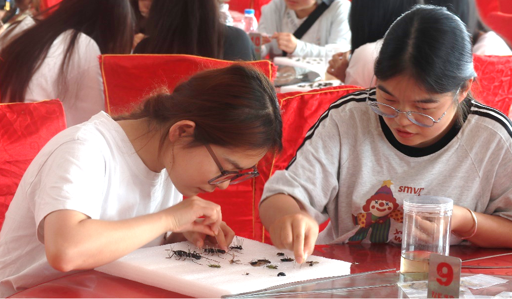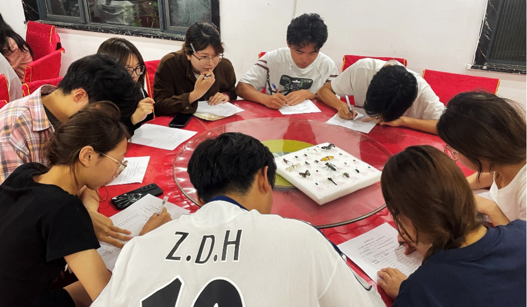 每日午后,驻地标本制作室便成为师生们的“第二课堂”。在植物学教师胡淑宝博士的指导下,同学们依次完成标本鉴定、整理、上台纸、固定、贴标签等工序。动物标本制作区,陈敏敏博士指导学生对采集到的昆虫进行整姿,用昆虫针固定其身体姿态,触角、足等部位都需按标准摆放;接着进行干燥处理,将整姿后的昆虫放入干燥箱或通风处晾干;最后在标本上贴上标签,注明昆虫名称、采集时间、地点等信息,制成完整的昆虫标本。