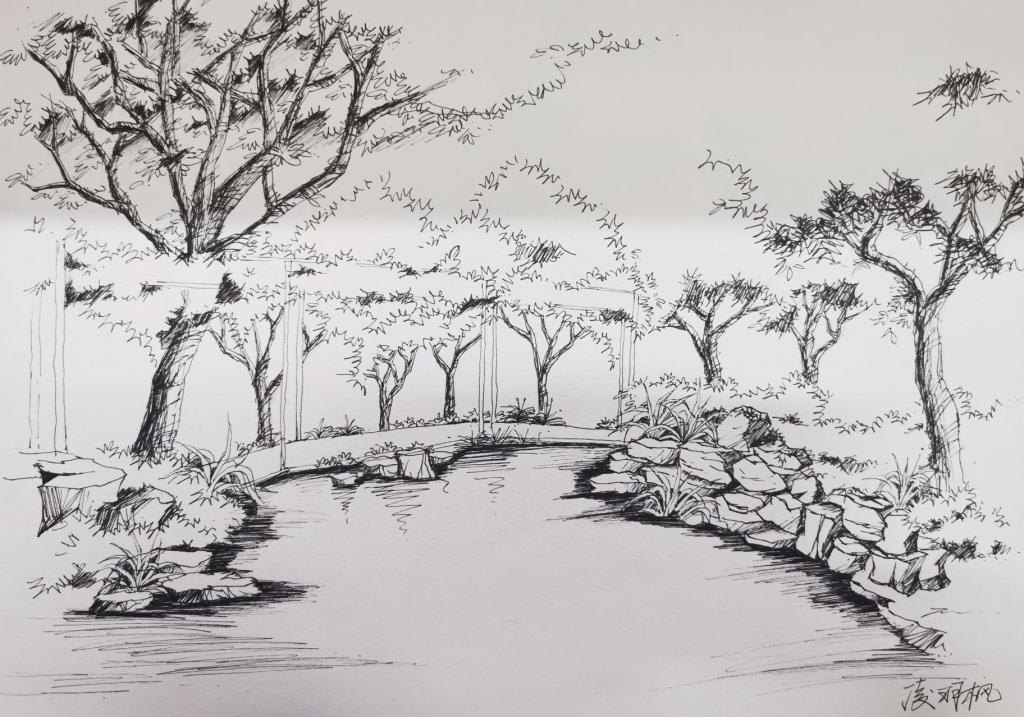 在陈陈老师的指导下,我们掌握了一些描绘假山,水池,树木,亭廊的方法,同学们对实景的描绘能力、对线条的控制能力、对明暗灰度的划分能力都获得很大提高,通过现场教学和绘画练习,不少同学作品,整个空间感层次明显,群落配置适宜,透视效果好。