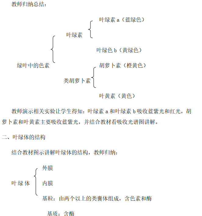 2、让学生讨论认识叶绿体的结构,这种结构有哪些适于进行光合作用的特点;光合作用的过程,影响因素等。