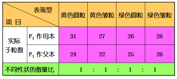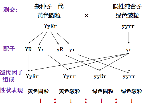 孟德尔所作的测交实验结果:我们发现无论正交还是反交,实验结果完全符合他的设想,说明他的理论推导是正确的,即F1在形成配子时,产生了四种配子,决定不同性状的遗传因子是自由组合的。