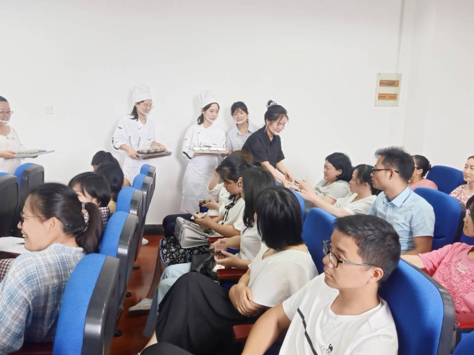 茶点制作完成后,在指导老师穆丹老师带领下,研究生们将亲手制作的茶点赠与学院平日里不辞辛劳的老师们,借茶点来感念师情。小小的茶糕不仅融入了中国传统的茶文化,更融入了同学们对建党百年的庆祝和对老师们的感恩。