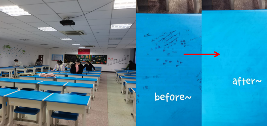 为将雷锋精神付诸于实际行动,生物科学类的十几位志愿者对生命科学学院教室的桌椅进行清理。将桌面上的涂鸦、修正带痕迹等处理干净,并将桌椅摆放整齐,学院教室焕然一新。同学们还给每个教室的讲台上放置了绿植,给教室添上了一抹绿色,让老师们在讲课时也能有舒适的环境。通过此次活动,让同学们领会到了劳动教育的深刻内涵和时代价值,也体会到奉献的快乐。