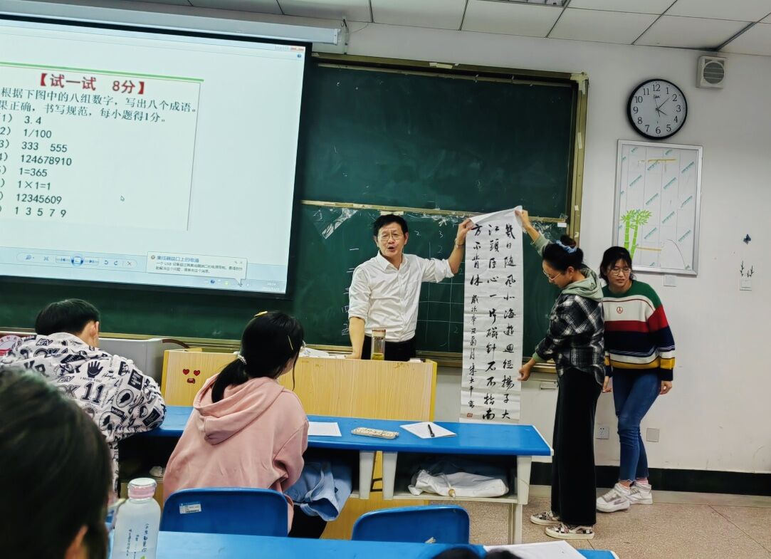 本次讲座通过分组讨论,游戏互动等方式对传统师生关系作了反思、对当前教育形势也作了思考,共同探析新课改背景下的新型师生关系。朱老师提出教师作为平等中的首席,在教育教学过程中要有条件地创设平等环境,引导师生关系民主平等、相互合作、愉快互动、共同快乐成长,使得学生在快乐中接受知识,提高成绩,而教师则愉快的完成相应的任务。报告会上,朱老师还赠予同学自己的两幅墨宝。